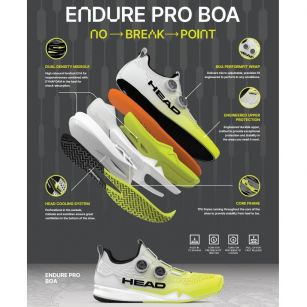- Идеальное сочетание скорости, долговечности и устойчивости, ENDURE PRO BOA MEN спроектированы с использованием технологии Dual Li2 BOA®. Разработанные и протестированные в лабораториях BOA® в Соединенных Штатах, а также в ходе интенсивных испытаний на корте, эти инновационные и супер-премиальные кроссовки имеют BOA® PerformFit™ Wrap и Dual Li2, которые обеспечивают микрорегулируемую точную посадку. Боковые панели обеспечивают дополнительную устойчивость по сравнению с другими методами шнуровки. Кроссовки являются частью новой серии ENDURE, которая заполняет пробел между REVOLT и SPRINT, объединяя лучшее из обоих миров. Благодаря своему элегантному силуэту эти кроссовки выглядят и ощущаются быстрыми, и вы можете легко переключаться с игры на задней линии на игру на всей площадке.